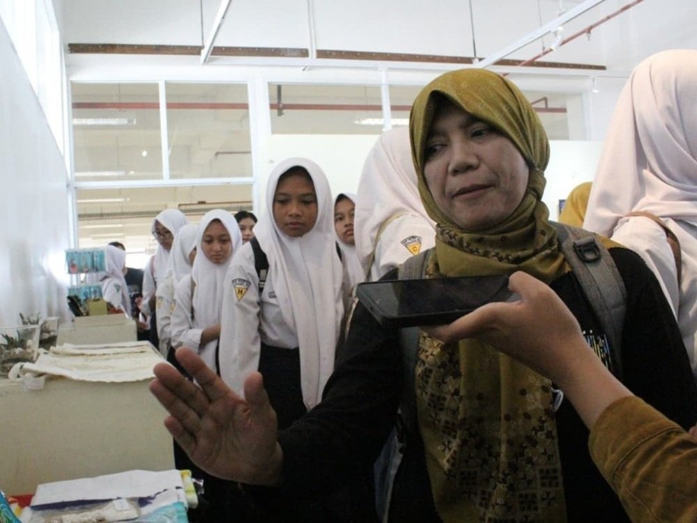 Nani, teacher from SMP Negeri 25 Malang, explaining her Batik Ciprat artwork. (Photo credit: Ananda Putri Noviana)